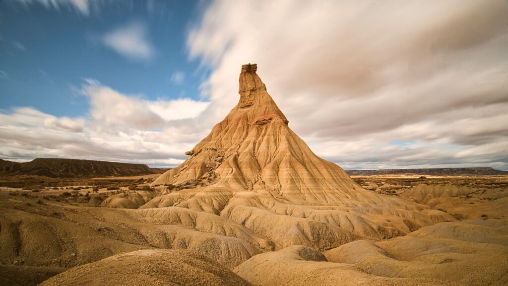 Le désert des Bardenas est souvent comparé à un décor de film de western ou même au Grand Canyon, mais il est situé en Espagne, à seulement 70 kilomètres des majestueuses Pyrénées. Cette particularité géographique offre un paysage à la fois étonnant et impressionnant, caractérisé par une géographie singulière et fascinante.